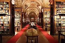 Leading from the central hall's east wall is a hallway with a candelabra designed by Edward F. Caldwell.[140] Three arched portals at the end of the hallway lead into the main lounging room (now the Reading Room), which occupies the full length of the Fifth Avenue facade.[4][140][142] The Reading Room contains a gilded ceiling with a central oblong panel surrounded by smaller panels.[73] The room was designed like a Roman Renaissance apartments. The walls have with pilasters reaching from the floor to the entablature, with the arched windows in between along the south and east walls. The arched portals on the west wall have marble door architraves, and the fireplace also has a marble architrave.[140] The pilasters have an ornate entablature, the paneled ceiling is gilded, and the frieze on the walls has marble panels.[140][142] The pilasters and woodwork are of Italian walnut, while the walls are fitted with a deep-toned red velvet.[4][136][140] The room was originally decorated with red, green, blue, and gold colors and had paintings.[143] In addition, there was red velvet furniture.[4][73]