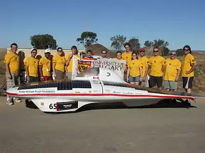 The University of Calgary Solar Car Team is a multi-disciplinary student-run solar car racing ("raycing") team at the University of Calgary, based in Calgary, Alberta, Canada. It was established to design and build a solar car to compete internationally in the American Solar Challenge (ASC) (previously named the North American Solar Challenge) and the World Solar Challenge (WSC). The team is primarily composed of undergraduate students studying Engineering, Business, Science, Arts and Kinesiology. The mission of the University of Calgary Solar Car Team is to educate the community about sustainable energy and to serve as an interdisciplinary project through which students and faculty from various departments can collaborate in supporting sustainable energy.
