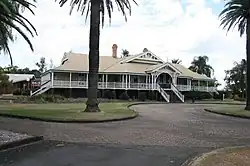 Professor Shelton was appointed as the first principal and the Queensland Agricultural College was officially opened by the Governor, Lord Lamington, on 9 July 1897. The College had an initial intake of twenty-three students and a staff of six men. The buildings were an administration and teaching block, two dormitories, a teacher's block, a dining room and kitchen, the Principal's residence and the Overseer's residence. The buildings were timber framed and clad, with cedar joinery and galvanised iron roofs. They were orientated to face south, in the direction of the Gatton-Forest Hill-Laidley Road and beyond this the Southern and Western Railway, where College Siding was established. The road to the siding was made all-weather proof in the early 1900s and served as the main entrance to the College until the mid-1920s, when the principal entrance was re-oriented to the north and the road from the Warrego Highway. In the first six months of operation a number of sheds, stables and a silo were constructed and machinery and livestock was purchased. Of the original buildings only the Foundation Building (the administrative and teaching block) and the Homestead (former Principal's residence) remain on the site.[1]