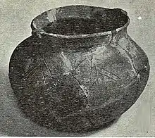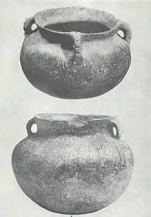Upper Mississippian pottery usually comes in the form of globular, round-bottomed vessels commonly called “jars”, with restricted orifices and vertical to flared rim profiles. The different ware styles and types are based on differences in temper (shell or grit), surface finish (plain, smooth or cordmarked) and decorative techniques which usually occur on the section of the vessel between the rim and shoulder, and on the lip.[10][6][28][7][18] Occasionally other vessel forms are present, such as bowls with vertical sides, or shallow pans.[7]