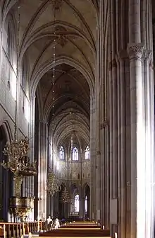 About 1272, work began on building a new cathedral in Östra Aros near the Fyris River to the south. It was constructed on the site of the earlier stone church dedicated to the Holy Trinity, located almost exactly where the cathedral's chancel now stands. It was here that Sweden's patron saint Eric Jedvardsson had attended mass before he was murdered in 1160.[5] The name of Uppsala was kept, and the surrounding town Östra Aros soon changed its name accordingly. The relics of Saint Eric, the treasure of Uppsala, were moved from Gamla Uppsala to the new site in 1273, along with the formal move of the archbishopric.[6] The church was designed by French architects although the name of the author of the detailed initial plans who supervised work until 1281 has not been recorded. In 1287, a promissory note drawn up by the provost of Paris covers the expenses to be incurred by master builder Étienne de Bonneuil and his assistants in travelling to Sweden to work on the construction of a cathedral at Uppsala. Étienne is credited with work at the east and south chapels of the chancel, the transepts and probably the south portal, although in most of his work he appears to have meticulously followed the plans of his predecessor.[5][7] Progress was slow as a result of the cold climate, the plague and many financial difficulties.[6] It was not until the end of the 14th century that work on the initial plans was completed, thanks in particular to the contribution of the master builder Nikolaus från Västerås who began construction of the nave.[8]