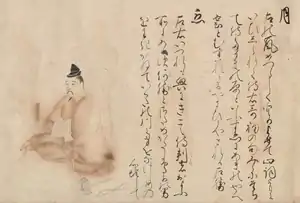 The judge was usually a poet of renown. During the Teijiin Poetry Contest the former emperor served as judge, and when one of his own offerings was matched against a superior poem by Ki no Tsurayuki, commented 'how can an imperial poem lose?', awarding himself a draw.[1] Fujiwara Shunzei served as judge some twenty-one times.[3] During the Poetry Contest in Six Hundred Rounds (六百番歌合) of 1192, he awarded victory to a poem with the line 'fields of grass', observing its reference to a previous work and commenting 'it is shocking for anyone to write poetry without knowing Genji'.[3] Judging another contest he wrote how, upon recital, there must be 'allure (en) and profundity (yūgen) ... an aura of its own that hovers about the poem much as a veil of haze among cherry blossoms, the belling of a stag before the autumn moon, the scent of springtime in the plum blossom, or the autumn rain in the crimson leaves upon the peak'.[7]