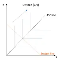 For a minimum function with goods that are perfect complements, the same steps cannot be taken to find the utility maximising bundle as it is a non differentiable function. Therefore, intuition must be used. The consumer will maximise their utility at the kink point in the highest indifference curve that intersects the budget line where x = y.[3] This is intuition, as the consumer is rational there is no point the consumer consuming more of one good and not the other good as their utility is taken at the minimum of the two ( they have no gain in utility from this and would be wasting their income). See figure 3.