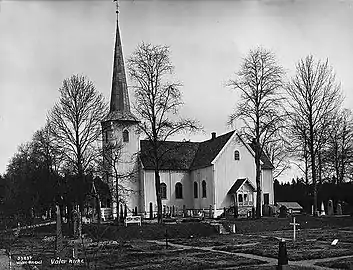 The earliest existing historical records of the church date back to the year 1394, but the church was not new that year. The first church in Våler was a wooden post church. According to tradition, the church was likely built during the 11th century, not long after Saint Olaf brought Christianity to the region in the year 1022. This church was located along the river Glomma, about 1.3 kilometres (0.81 mi) south of the present church site. Around the year 1200, a new, larger wooden stave church was built on the same site after the old church was torn down. There are decorative pieces from this old church that date to around the year 1200 that are preserved in museums. Some time before the year 1739, the old church had been renovated and enlarged by adding transepts to create a cruciform floor plan. By the year 1786, the church was described as in very poor condition and at the start of the 1800s, the parish was planning for a new church.[3][4]