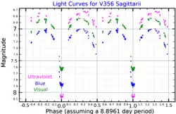 Light curves for V356 Sagittarii, in three photometric bands. Plotted from data published by Wilson and Woodward (1995).[1]
