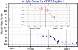 ![]() A visual band light curve for V4332 Sagittarii. The main plot, adapted from Tylenda et al. (2015),[1] shows the long-term variability, and the inset, adapted from Martini et al. (1999),[2] shows the variation during the first weeks of the eruption. | |