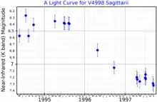 V4998 Sgr's high mass compresses its core and accelerates fusion primarily by the CNO cycle which leads to a luminosity of about 4,000,000 L☉ and a temperature of 12000 K. It boasts a large ejection nebula with a diameter of about 0.8 parsec (2.5 ly) and a mass of 6.2 M☉.[4] Since comparable nebulae typically last no more than 10,000 years, V4998 Sagittarii is presumed to have undergone a massive eruption 5000-10,000 years ago.[4]