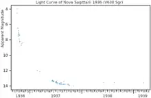 There is disagreement within the astronomical literature about what this nova's peak brightness was. Both Warner[4] and Downes et al.[6] report a peak brightness of magnitude 1.6 but Duerbeck reports 4.0[3] in rough agreement with the Harrison and Gehrz value of 4.5.[7] The AAVSO database contains no magnitude estimates for this star brighter than 6.5 (on 8 October 1936), indicating that whatever the peak brightness was, the star was barely visible to the naked eye just five days after its discovery. Its light curve shows it to be one of the most rapidly fading novae on record.[5]