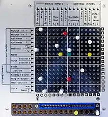 User's eye view of the "VCS 3";[# 1] top left, three main oscillators; bottom left, patch panel; bottom right, joystick. External keyboard not shown.