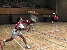 - V2 is played by two players on a squash court with three balls. This version is possibly the most intense of the official versions. A game lasts for two halves of four minutes each.[11]