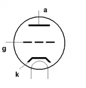 Triode symbol. From top to bottom: plate (anode), control grid, cathode, heater (filament)