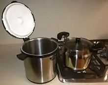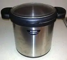 A thermal cooker, or a vacuum flask cooker, is a cooking device that uses thermal insulation to retain heat and cook food without the continuous use of fuel or other heat source. It is a modern implementation of a haybox, which uses hay or straw to insulate a cooking pot.