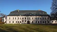 Valašské Meziříčí has a small historic centre formed by the town square and its surroundings, including the Žerotín Castle. The town square is lined by preserved burger houses.[2] One of the most valuable monuments of the historic centre is the parish Church of the Assumption of the Virgin Mary. The originally Gothic church was first mentioned in 1419, after it replaced an old church from the 13th century. The Renaissance tower with a portal was added in 1581 and the Baroque Chapel of the Virgin Mary was added in 1681–1682. In the mid-18th century, the church was baroque rebuilt.[8]