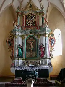 There is evidence to suggest that an earlier Romanesque church existed in the village, as remnants could formerly be seen beneath the floor of the sacristy. This building is believed to have been 10 m long, less than half the length of the present church. The latter, in Gothic style and dedicated to Saint Peter,[1] was begun in the 14th century. The small nave has a vaulted ceiling with a complex network of ribs, which rest on seven pairs of poles attached to the walls. The choir has a ceiling of the same type.[2] Built in 1528, the pulpit was produced in a period of transition from Gothic to Renaissance.[3]