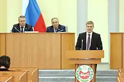 Immediately after the inauguration, Konovalov held a meeting of the regional government, at which he dismissed the remaining Ministers and their deputies (13 high-ranking officials resigned from the government the day before). On the same day, Konovalov made his first appointment. Deputy of the Supreme Council of Khakassia, from United Russia Andrey Asochakov took the position of the First Deputy Head of Republic. Konovalov said he would coordinate finance and communication with the Russian federal government. Secretary of the Tula Regional Committee of the Communist party and mayor of Donskoy in the Tula Region Bogdan Pavlenko took the post of Deputy Head of Republic. Konovalov said Pavlenko would direct the apparatus of his administration and restructure the local government.[22]