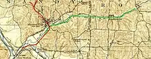The B&O was threatened with losing access to many of the southern Ohio markets it relied on in 1899. The first threat came from the Cleveland and Marietta Railway. In 1872, it built a branch line from Marietta, Ohio, to the B&O main line at Harmer Junction.[73] This allowed B&O and CT&V freight to be shipped on the Cleveland and Marietta (C&M) directly to Cleveland (or to be transferred at Canton and shipped to Cleveland). The Cleveland and Marietta said it would no longer accept freight for either railroad beginning January 1, 1900.[74] That same year, the Wheeling & Lake Erie acquired the Cleveland, Canton and Southern Railroad, whose track from Cleveland to Canton and then to Coshocton and Zanesville. The W&LE said it would cancel the CT&V's trackage rights,[3] which threatened to cut the CT&V completely off from all southern routes and markets. In response, the CT&V began to swiftly survey a route from Valley Junction to Canal Dover (now Dover)[75] and then to Newark, Ohio,[74][76] which would give it a link to the B&O's main line and threaten to eat significantly into traffic on both the C&M and the W&LE. To avoid construction of an independently owned new main line, the Pennsylvania Railroad agreed to give the B&O subsidiary trackage rights between Valley Junction and Canal Dover. At Canal Dover, the CT&V connected with the Lake Shore and Tuscarawas Valley Railroad (now operating as the Cleveland, Lorain and Wheeling Railroad).[3]