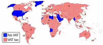 VAT in Barbados was introduced on 1 January 1997 and replaced 11 other different taxes.[26] It was originally introduced at a rate of 15% but was later increased to a rate of 17.5% on most goods and services in 2011.[27] VAT on restaurant and hotel accommodations between 10% and 15% while no tax is levied on certain foods and goods listed by the government.[28] The revenue is collected by the Barbados Revenue Authority.[29]