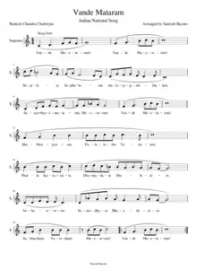Vande Mataram (Vande Mātaram, also spelt Bande Mataram; Bônde Mātôrôm; transl. I praise you, Motherland) is a poem written in Sanskrit and Sanskritised Bengali[1][2] by Bankim Chandra Chatterjee in the 1870s.[3][4] The first two verses of the poem were adopted as the National Song of India in October 1937 by the Congress.[5][6][7]
