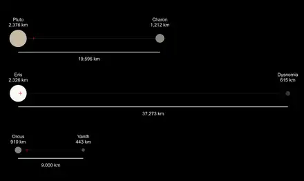 Diagram of three binary trans-Neptunian dwarf planets and their satellites with true colors, diameters, and distances to scale. Each system's barycenter position marked is in red crosshairs.