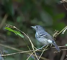 The variable antshrike is a thickset bird with a total length of approximately 14–16 cm (5.5–6.3 in).[3] The male has black wings with grey edging to the remiges (sometimes very narrow, and barely visible in the subspecies where the males are primarily black), and white wing-bars that may appear spotty, especially on the lesser wing coverts. The tail is black with white tips (best visible from below). In the eastern, central and southern subspecies, the chest and most of the head are grey, the back is grey with variable amounts of black (may be almost entirely black), a semi-concealed white interscapular patch, and the crown is black (black crown reduced in far north-eastern Brazil). The variation in the colour of the belly and crissum (the undertail coverts surrounding the cloaca) is highly complex, ranging from white in some subspecies, over grey in others, to deep cinnamon. The male of the western subspecies melanochrous from the Andes of Peru is strikingly different, being overall black except for the white in its wings and tail. The male of the subspecies aspersiventer of the Andes in north-western Bolivia and adjacent Peru approaches melanochrous in colour, but has dense white barring to the belly.