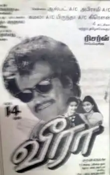 Veera was released on 14 April 1994 during the Puthandu holiday.[48][49] The film opened in competition with Indhu,[50] Honest Raj,[51] Sakthivel and Seeman, which were released the same week.[52][53]