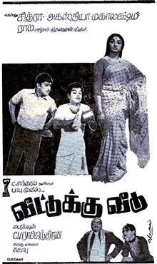 Veettuku Veedu (transl. Home to Home) is a 1970 Indian Tamil-language comedy film directed by C. V. Rajendran and written by Chithralaya Gopu. It is based on Gopu's play Thikku Theriyatha Veettil (transl. Lost in the dense house) which was based on the English play Right Bed Wrong Husband.[1] The film stars Jaishankar, Lakshmi, R. Muthuraman, Vennira Aadai Nirmala and Nagesh, with V. K. Ramasamy and Major Sundarrajan playing supporting roles. It was released on 29 May 1970. The film was remade in Kannada as Galate Samsara (1977) again directed by Rajendran.[1]