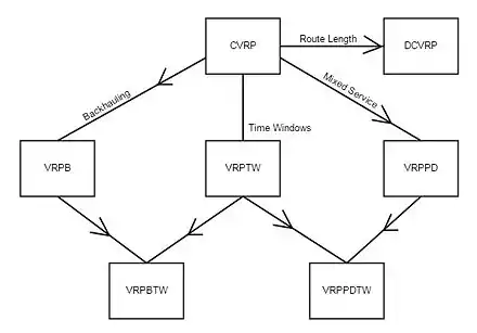 - Capacitated Vehicle Routing Problem: CVRP or CVRPTW. The vehicles have a limited carrying capacity of the goods that must be delivered.