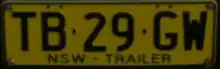In August 2014, a new trailer plate was introduced consisting of black characters on a white background, and a plain "NSW" legend. This plate uses the same two-letter, two-number, two-letter serial format as car plates, but has T as the first letter, with the first serial being TR-00-AA. This serial format began to be used on the current mid yellow trailer plate as well from December 2014, beginning with TA-00-AA; at the same time, the legend on this plate was changed from the full state name to "NSW – TRAILER", the whole TI series was skipped.