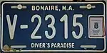 2007 | Embossed white serial on dark blue background with sticker box at right all in the center; "BONAIRE, N.A." centered at top; slogan centered at bottom | Diver's Paradise | V-1234 | ||