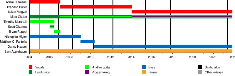 After recording a self-released demo in 2005, guitarist Scott Okarma briefly joined the group, participating in local shows and early touring. At this point, Veil of Maya were a six-piece band with three guitarists, but this only lasted for a few months before both Marshall and Okarma left the band. Bryan Ruppell replaced them both on rhythm guitar thus reverting their lineup back to five members.