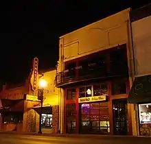 In 1888, banker John W. Shute built a two-story building on East Main Street as the new home for the First National Bank of Hillsboro. The structure featured a façade in the Italianate style of architecture, external cast iron ornamentation, and a roof line with a bracketed cornice. In 1911, the bank moved across Main Street and later mayor Orange Phelps purchased the building.[5] Although Phelps did not have the money to buy the building, the bank loaned him the funds and he opened The Grand Theater, a 200-seat theater.[6] The 19 feet (5.8 m) wide by 120 feet (37 m) long theater was expanded in 1915 to 500 seats and named the Liberty Theater.[6][7]