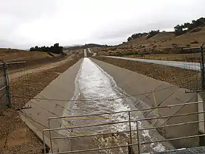 The flow of the Ventura River and its tributary Coyote Creek have been reduced by the completion of Casitas Dam, which forms Casitas Reservoir. The dam is on Coyote Creek about 2 miles upstream of the junction with the Ventura River. The Robles Diversion Dam was constructed on the Ventura River in 1958 to divert up to 107,800 acre-feet of water per year through a four-and-a-half mile canal to Casitas Reservoir.[22] About 40% of the total water in Lake Casitas is supplied from high winter flows in the Ventura River. Casitas Municipal Water District sells water to both domestic and agricultural customers.[23]