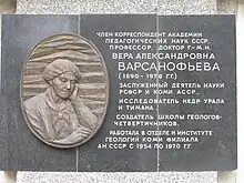 Vera Aleksandrovna Varsanofieva (22 July 1890, Moscow — 29 June 1976) was a Soviet geologist, geomorphologist, a member-correspondent of the USSR Academy of Pedagogical Sciences, and an honored scientist of the RSFSR. She was the first woman to be awarded the degree of Doctor of Geological and Mineralogical Sciences.[1]