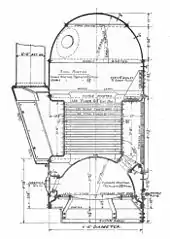 The boiler is a cylindrical vertical water drum with a hemispherical domed top. This domed shape is strong enough not to require staying. The firebox is another hemispherical dome, riveted to the base foundation ring to give a narrow waterspace.