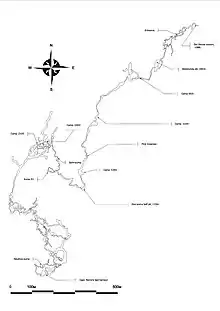 - March 2018 – another expedition of the same team added more than a kilometer of tunnels to the cave map. They also measured the depth of The Last Nemo Station terminal siphon lake. It was 8.5 m (28 ft) and so the total cave depth reached 2,212 metres (7,257 ft).[1]