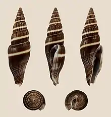 The narrow shell has a fusiform shape. It is dark brown with white spiral bands (sometimes carrying a red thread). The spire is elongate and sharp. The shell contains 11 slightly convex whorls. The distinct suture is slightly constricted. The first 8-9 whorls are longitudinally ribbed, spirally multisulcate, then spirally striated. These spirals become rather weak on the last half of the body whorl. The body whorl is shorter in proportion to the spire and is contracted at the base. It is roundly convex, decorated with a white band above and below the middle, very narrow below the middle, ending in a short tail, spirally lirate. The brown columella has five, cream plaits. The interior of the aperture is violet. The outer lip is thick, smooth and borderd with dark purple-brown. [2]