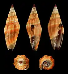The shell is stoutly fusiform with a high spire. The spire is acuminated. The seven whorls are transversely impressly striated with narrow spiral grooves, sometimes smooth towards the upper part and longitudinally ribbed. The ribs are rude, obtuse, of the body whorl sometimes indistinct. The ribs become strong at the angular shoulder. The suture is channeled. The outer lip is slightly concave and lirate within. The shell is whitish or yellowish orange, more or less banded with brown, sometimes encircled with pale reddish fillets, base and apex blackish. The white columella is four-plaited, stained at the upper part with black.[3]