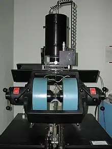 A vibrating-sample magnetometer (VSM) (also referred to as a Foner magnetometer) is a scientific instrument that measures magnetic properties based on Faraday’s Law of Induction. Simon Foner at MIT Lincoln Laboratory invented VSM in 1955 and reported it in 1959.[1] Also it was mentioned by G.W. Van Oosterhout[2] and by P.J Flanders in 1956.[3] A sample is first placed in a constant magnetic field and if the sample is magnetic it will align its magnetization with the external field. The magnetic dipole moment of the sample creates a magnetic field that changes as a function of time as the sample is moved up and down. This is typically done through the use of a piezoelectric material. The alternating magnetic field induces an electric field in the pickup coils of the VSM.[4] The current is proportional to the magnetization of the sample - the greater the induced current, the greater the magnetization. As a result, typically a hysteresis curve will be recorded[5] and from there the magnetic properties of the sample can be deduced.