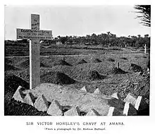 In 1910, Horsley was commissioned as a captain in the Territorial Army, in the 3rd London General Hospital of the Royal Army Medical Corps.[11] On the outbreak of the First World War, he volunteered for active duty on the Western Front, where he was initially posted as surgeon at the British hospital at Wimereux, France.[7] In May 1915, he was posted as a colonel and Director of Surgery of the British Army Medical Service in Egypt, based at the 21st General Hospital in Alexandria, in support of the Dardanelles Campaign.[6] In the following year, he volunteered for field surgery duty in Mesopotamia, where he died unexpectedly in Amarah, Iraq, on 16 July 1916, of heatstroke and severe hyperpyrexia, at only 59 years of age.