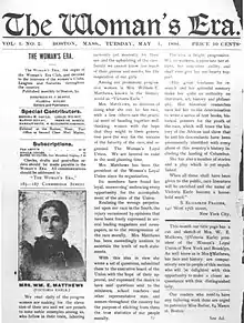 In the early 1890s, Matthews became more involved in the African-American political and social circles. On October 5, 1892, Victoria Earle Matthews and educator and activist, Maritcha Remond Lyons, organized a testimonial dinner in New York's Lyric Hall for Ida B. Wells and her anti-lynching campaign which led to the founding of the Woman's Loyal Union of New York and Brooklyn.[11][12] It was a time of the rise of fraternal and women's organizations, and Matthews served as the first president of the Woman's Loyal Union (WLU).[9] The WLU was a civil rights organization that worked against racial discrimination and supported the anti-lynching crusade of the journalist Ida B. Wells. Matthews served as the chairman of the executive board in 1896 of the National Association of Colored Women.[13] She frequently spoke on the issues of the times. Matthews was best known for her speeches "The Value of Race Literature", "The Role of Afro-American Women", and "The Awakening of the Afro-American Woman" (1897).[14] "The Value of Race Literature was delivered at the First National Congress of Colored Women in Boston, Massachusetts on July 30th, 1895.[15] Her speeches were rooted in the philosophy of race pride and self-worth.