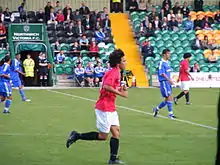 The terraced Dane Bank Stand had a capacity of 2,988 spectators, and was moved from the club's original Drill Field ground in Northwich Town Centre following the stadium's demolition.[10] Following the closure of the Victoria Stadium, the Dane Bank Stand was once again moved. The steel-work was re-fabricated and is now the "Saint Mary's Road End" terrace at FC United of Manchester's Broadhurst Park ground.[11]