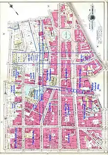 The map shows the street grid in 1910, and shows in blue three important road alignment changes that came in the 1920s–1950s: