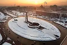 Victory Square is home to the Monument to the Heroic Defenders of Leningrad, which commemorates the victims and survivors of the Siege of Leningrad. The monument, designed by Sergey Speranskiy and Valentin Kamenskiy, and sculpted by Mikhail Anikushin, was erected in 1975 to coincide with the 30th anniversary of the end of the war. It consists of a 48–metre high obelisk, a large circular enclosure, and a subterranean Memorial Hall.[1]