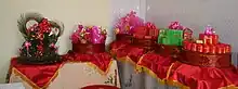 In the procession, the groom, his family and friends bear elaborately decorated mâm quả, or lacquer boxes, covered in red cloth. Inside these boxes are gifts representing the dowry that the groom's family will bring to the bride's family. Gifts include betel leaves, fruit, cakes, a roasted pig, fabric, and an abundance of jewelry for the bride, and are typically carried by the groomsmen- like the engagement ceremony. Usually, the number of gift boxes is 5, 7, or 9.