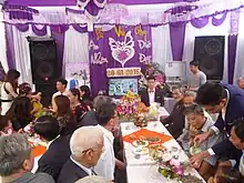 The bride and groom, in front of all their guests, will turn to their parents. Each parent will then give advice about marriage and family to the couple. A candle ceremony will follow, symbolizing the joining of the bride and groom and the joining of the two families. The bride's family will then reveal their gifts to the new couple, which include but are not limited to a pair earrings and at least one kièng. The groom's mother will then put each piece on the bride for good fortune. Rings may be exchanged between the couple. Half of the gifts received by the bride's family will then be returned to the groom's side.