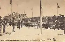 The section between Tavira and Vila Real de Santo António entered service on 14 April 1906 and was then considered part of the South Line.[6][7] However, the inauguration was criticised in an article published in Tavira's O Heraldo newspaper, which accused the government of having opened the line to traffic before it was completely finished, in order to benefit political circles in the eastern Algarve. According to the article, the Vila Real de Santo António railway station entered service without meeting the necessary conditions for its functions, and the houses for the staff, the remise and the turntable, among other infrastructures, had yet to be built.[8]