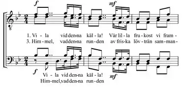 4 time, marked Andante.[11] It has six verses, each consisting of 14 lines, the end of the last line being repeated after a Corno interlude. The verses have the rhyming pattern AAAB-CCCB-BABABB.[11] The origin of the melody is disputed, and it may well have been one of the very few of Fredman's Epistles (perhaps the only one) composed by Bellman himself, apparently in 1790, making it one of the last to be written. Afzelius noted that the melody resembles that of Epistle 25, "Blåsen nu alla"; this would involve a change from 3