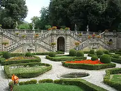 Santini rebuilt the south facade in the Baroque style at the end of the seventeenth century, probably in imitation of the architecture of Versailles where he was ambassador to the Republic of Lucca. The rebuilding involved the addition of two wings to the villa, and the modification of the front by the addition of a massive scale range leading to a serliana, duplicated on the upper floor with two balconies, decorated with statues. He also laid out new gardens. At the front, parterres were arranged around two pools. At the rear, a fountain was built as the focus of the garden, and another sunken 'garden of Flora' was laid out to the east.