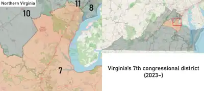 From 2017 to 2023, the district spanned across much of Central Virginia including all of Orange, Culpeper, Goochland, Louisa, Nottoway, Amelia, and Powhatan counties. The district also included large portions of Chesterfield and Henrico counties in the suburbs of Richmond. However, Richmond was not in the 7th. Spotsylvania County also had a large portion in the 7th district just outside of Fredericksburg.[7]