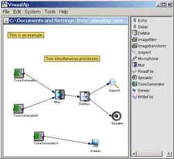 The programming language used in VisualAp to describe a system is a dataflow programming language. Execution is determined by the structure of the graphical block diagram on which the programmer connects different components by drawing connectors. These connectors propagate variables and any component can execute as soon as all its input data become available. Internally the VisualAp programming language is based on XML.